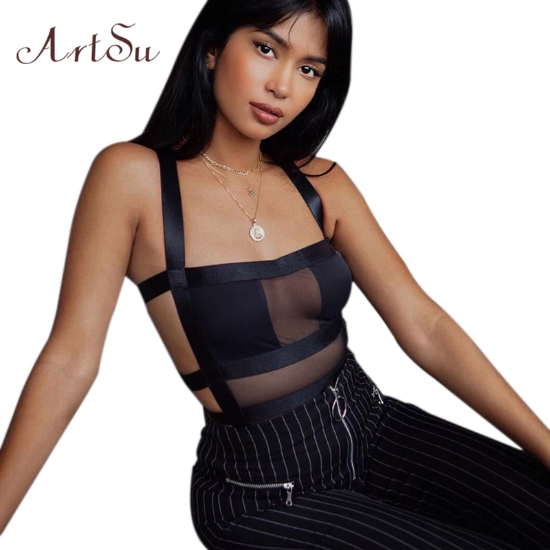 شراءمعلومات اضافية ArtSu شبكة انظر من خلال النساء مثير ارتداءها الشارع الشهير خليط عارية الذراعين حزام أسود Bodycon الإناث الجسم رومبير جديد ASJU41103