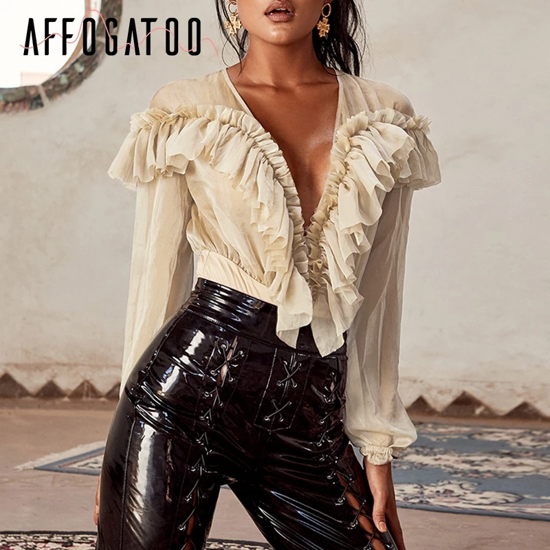 صور من Affogatoo مثير v الرقبة أنيقة كشكش النساء ارتداءها قميص خمر طويلة الأكمام بلوزة ارتداءها 2019 الصيف السيدات playsuit رومبير