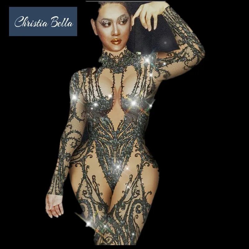 المنتجات ذات الصلة ل Bodysuits و Christia بيلا مثير حجر الراين طباعة المرأة حللا حزب عارية داخلية ملهى ليلي أزياء رقص المرحلة الأداء الملابس