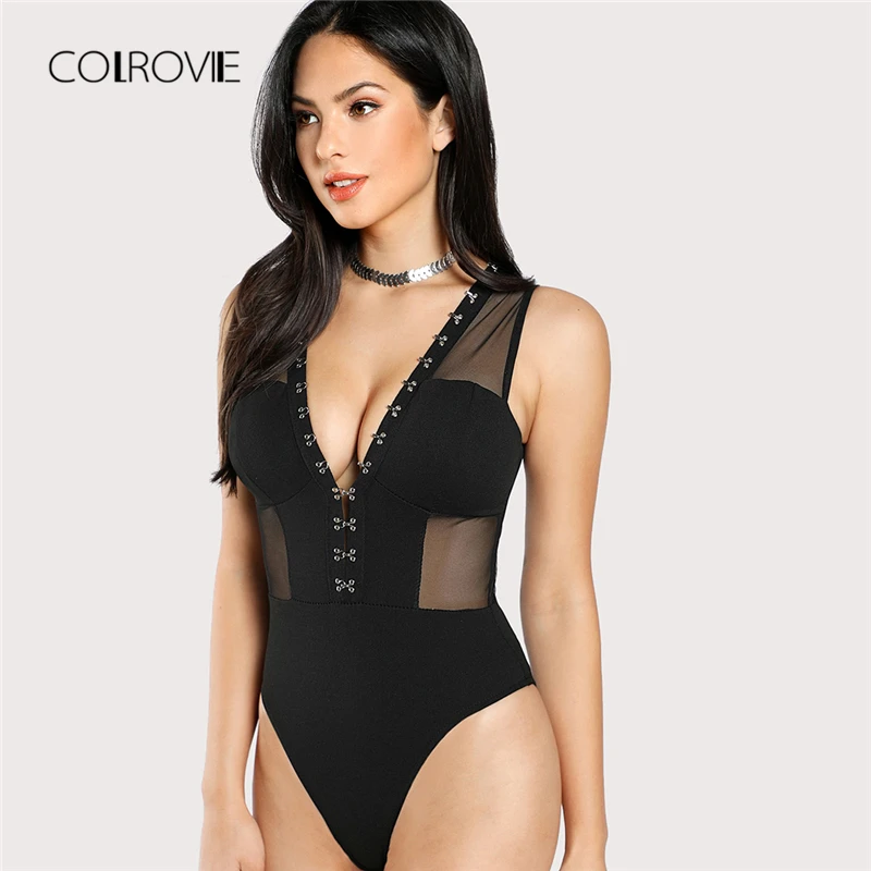 المنتجات ذات الصلة ل Bodysuits و COLROVIE شبكة إدراج هوك و العين صد مثير ارتداءها 2018 جديد الصيف الأسود أكمام نحيل ارتداءها V الرقبة النساء ارتداءها
