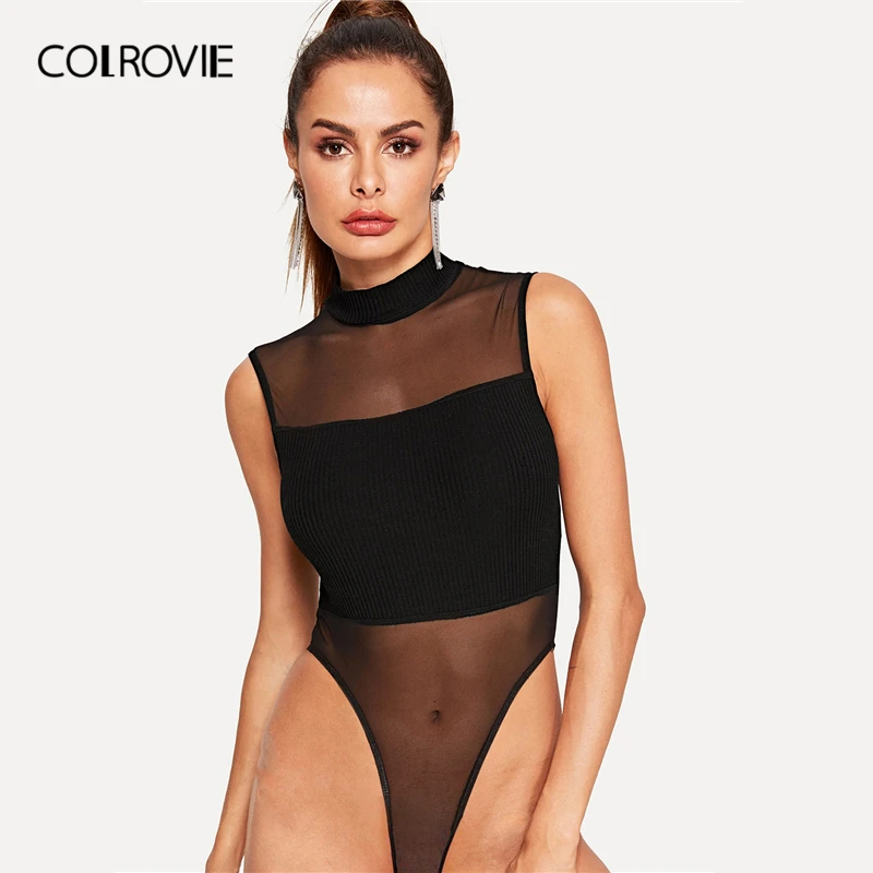 استعارات من COLROVIE الأسود موك الرقبة مضلع حك إدراج عالية الخصر مثير نحيل ارتداءها المرأة 2019 أكمام بسط شير نادي داخلية