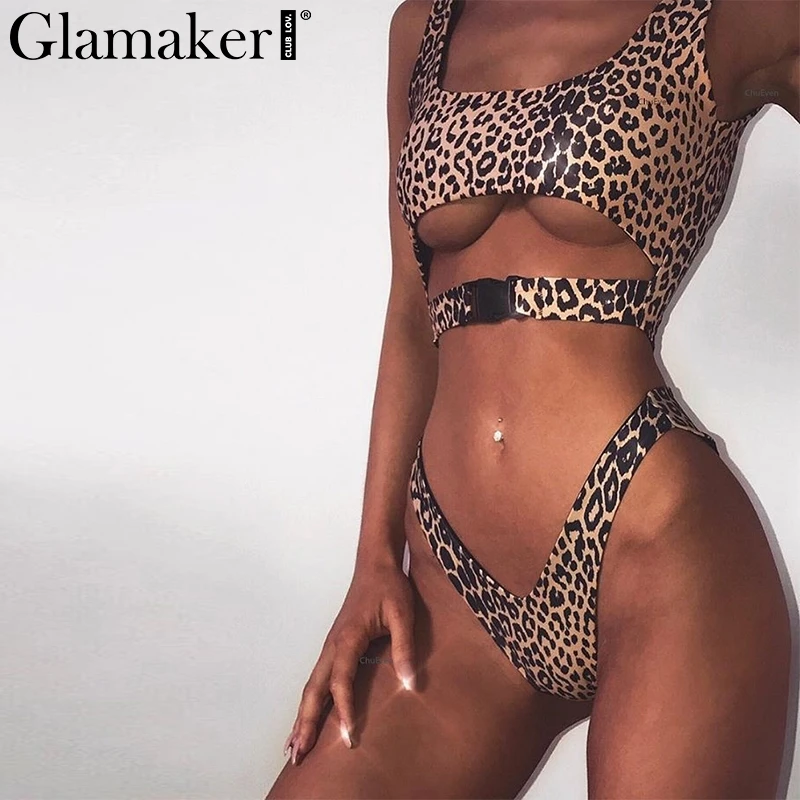 معرض من Glamaker ليوبارد طباعة رفع ارتداءها المرأة مثير الصيف bodycon ارتداءها الإناث الجوف خارج ثوب السباحة اثنين من قطعة بدلة السروال القصير