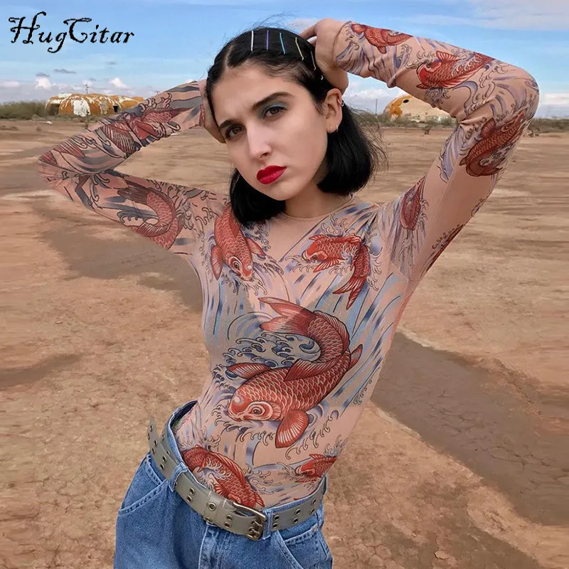 أرغب في شراءمعلومات اضافية Hugcitar س الرقبة الأسماك طباعة شبكة انظر من خلال bodycon مثير ارتداءها 2019 الربيع النساء جديد أزياء حزب نادي الشارع الشهير الجسم