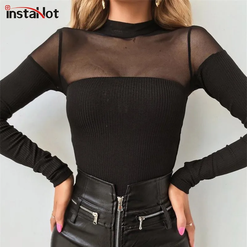 وانت enأرغب في شراء Bodysuits, pues InstaHot محبوك مثير انظر من خلال شبكة داخلية النساء موك الرقبة 2018 الخريف الغزل زر قمم بسط كم طويل داخلية tal vez poner appeal