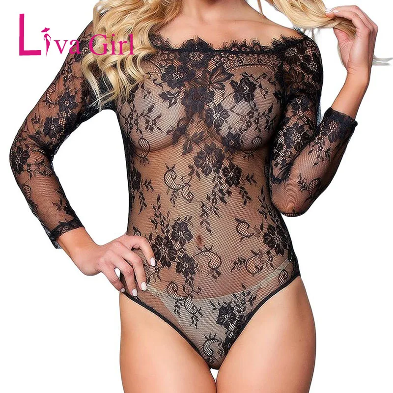 المنتجات ذات الصلة ل Bodysuits و Liva فتاة شفافة مثير الدانتيل Bodycon ارتداءها النساء شبكة كم طويل انظر من خلال التطريز بذلة أسود أحمر الأزياء رومبير